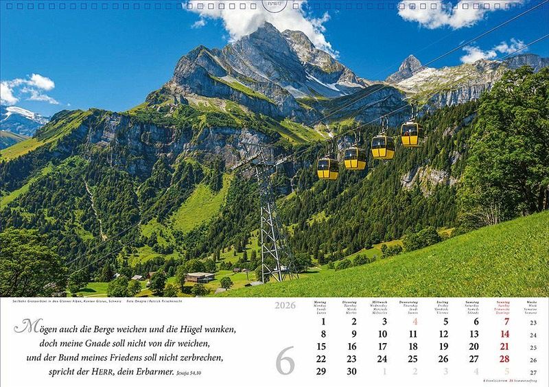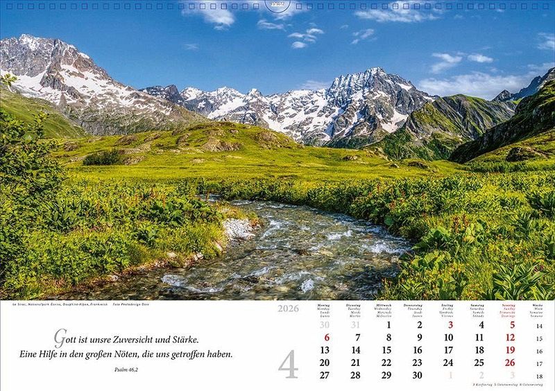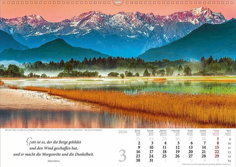 Auch für 2026 erscheint wieder der erfolgreiche Kalender "Lobet, ihr Berge, den Herrn". Die Verbindung von ausgewählten und eindrucksvollen Bergmotiven und dazu passende Bibel- und Liedverse sind das Besondere dieses Kalenders. Täglich erinnern die Verse und die eindrücklichen Bilder den Betrachter daran, wie wunderbar und einzigartig Gottes Schöpfung ist. Der ideale Jahresbegleiter für alle Liebhaber von Berg- und Gebirgslandschaften