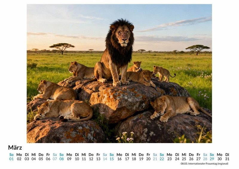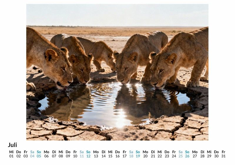 Ein Brüllen durchbricht die Stille der Savanne. Der Kalender "Löwe" fängt die ungezähmte Kraft und majestätische Ruhe des Königs der Tiere in zwölf einzigartigen Motiven ein. Er zelebriert das Symbol für Mut und Souveränität in all seinen Facetten und begleitet durch ein ganzes Jahr. Dieser Kalender ist optimal geeignet für: Liebhaber von Wildtieren und der afrikanischen Savanne. Menschen, die kraftvolle und symbolträchtige Tiermotive schätzen. Alle, die eine besondere Wanddekoration mit Charakter suchen. Jeder Monat enthüllt eine neue Seite des Löwen. Von der souveränen Haltung des Rudelführers über die verspielte Neugier der Jungtiere bis hin zu den nachdenklichen Momenten in der goldenen Abendsonne. Jedes Bild wurde durch komplexe Algorithmen komponiert, um die Essenz dieser faszinierenden Raubkatzen auf eine neue Art darzustellen. Die Motive zeigen die Tiere in ihrer natürlichen Umgebung und fangen ihre charakteristische Ausstrahlung ein. Beim Kauf dieses Kalenders kann man Folgendes erwarten: Zwölf Monatsmotive des Königs der Tiere. Ein übersichtliches Kalendarium für die Planung des Jahres. Ein Wandkalender, der in jedem Raum als Blickfang dient. Der Kalender "Löwe" ist eine Hommage an die Stärke und Anmut des wohl beeindruckendsten Raubtiers. Er begleitet durch das Jahr mit Bildern voller Ausdruck und Präsenz. Ein Blick auf die Monatsansichten offenbart die faszinierende Ausstrahlung des Königs der Tiere.