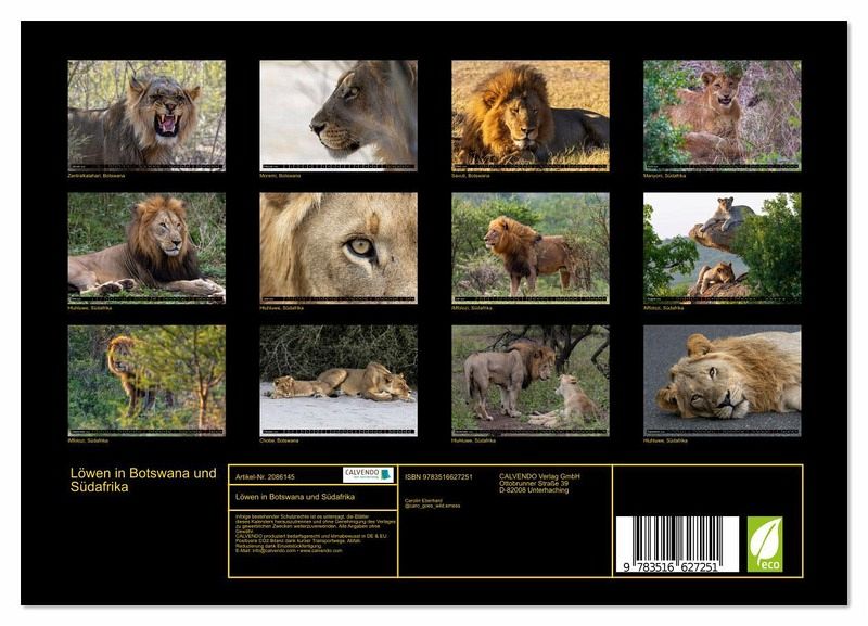 Erleben Sie die Faszination wilder Löwen in zwölf ausdrucksstarken Bildern aus Botswana und Südafrika. Jede Aufnahme fängt die Anmut, Kraft und stille Würde dieser beeindruckenden Tiere ein. Der Kalender bringt ein Stück afrikanisches Abenteuer in Ihr Zuhause - kraftvoll, zeitlos und voller Emotion. Ein besonderes Highlight für alle, die die Magie der Wildnis lieben.