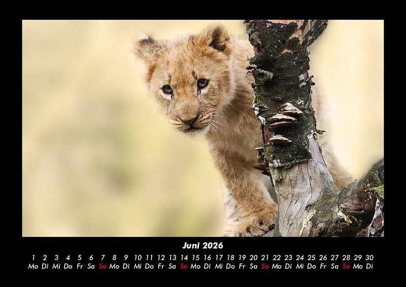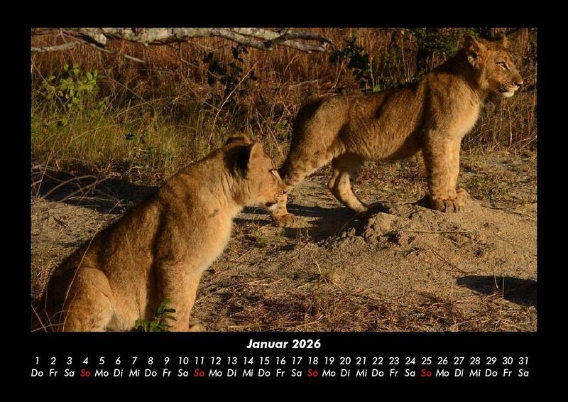 Löwen in der Wildnis 2026 Motivkalender DIN A3 Dieser Kalender zeigt prachtvolle und majestätische Löwen in der freien Wildbahn. Von Löwenjunges bis ausgewachsener Löwe ist alles dabei. Vero-Kalender erhalten Sie mit Motiven aus den verschiedensten Themenbereichen wie Natur, Blumen und Landschaft, Tierwelt, Architektur, Reise und Urlaub, Technik, Automobil und Eisenbahn, Emotionen, Sport und Musik. Gedruckt werden die Monats-Kalender aus dem Vero Verlag auf hochwertigem Kalenderbogen in Premium-Qualität und verschiedenen Größen. Die Vielfältigkeit der Motive unserer Foto-Kalender ist dank der Zusammenarbeit mit kreativen Fotografen möglich.