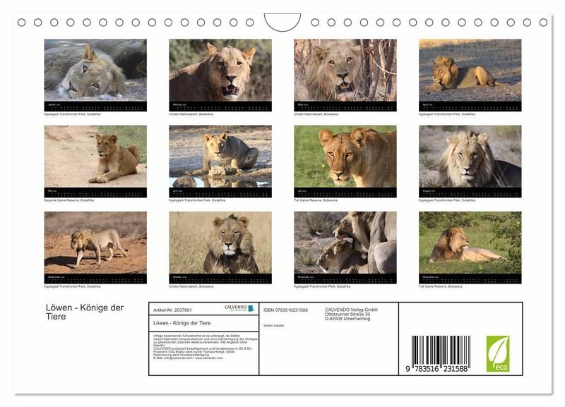 Der Fotograf Stefan Sander war zu Besuch in einigen der bekanntesten Nationalparks des südlichen Afrikas. Während dieser Besuche gelangen ihm wunderschöne Aufnahmen der grossen Katzen Afrikas in ihrem natürlichen Lebensraum. Lassen Sie sich verzaubern und erleben Sie afrikanische Momente, ein ganzes Jahr lang.