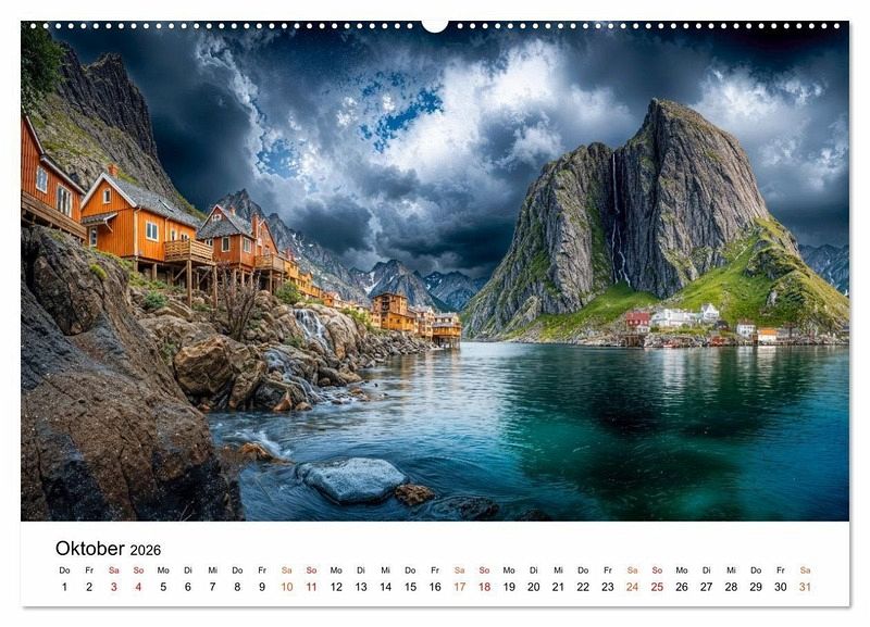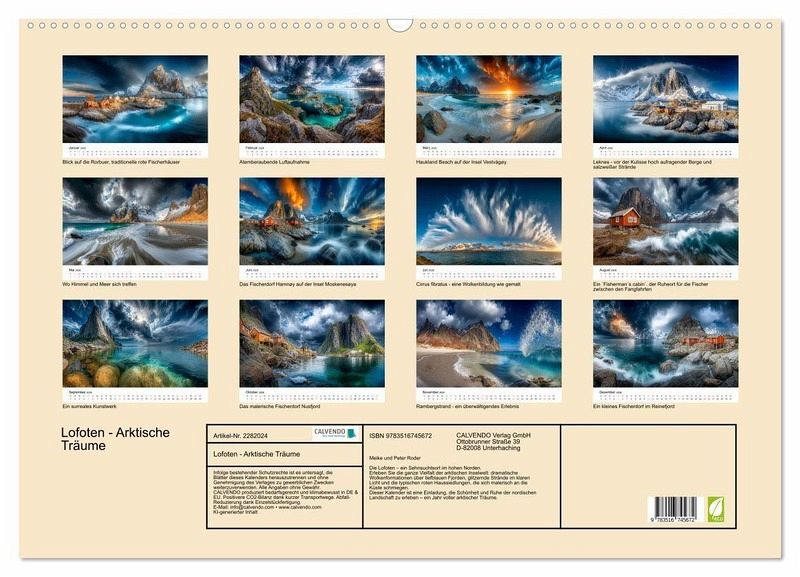 Ein Jahr voller Sehnsucht nach dem Norden, lassen Sie sich Monat für Monat in die faszinierende Welt der Lofoten entführen. Jedes Bild ist ein Fenster in die arktische Schönheit - rau und zugleich poetisch. Mal schweben dramatische Wolkenformationen über den Fjorden, mal glitzern die weißen Strände im klaren Licht, mal schmiegen sich die typischen roten Haussiedlungen an die Küste. Gestaltet mit dem Auge fürs Detail werden diese Bilder zu einer faszinierenden Reise nördlich des Polarkreises, wobei die grafische Umsetzung im Zusammenspiel klassischer Gestaltung und ausgewählter KI-basierter Methoden erfolgte. Ein Kalender für alle, die die Kraft der Natur lieben und sich von nordischen Träumen begleiten lassen möchten.