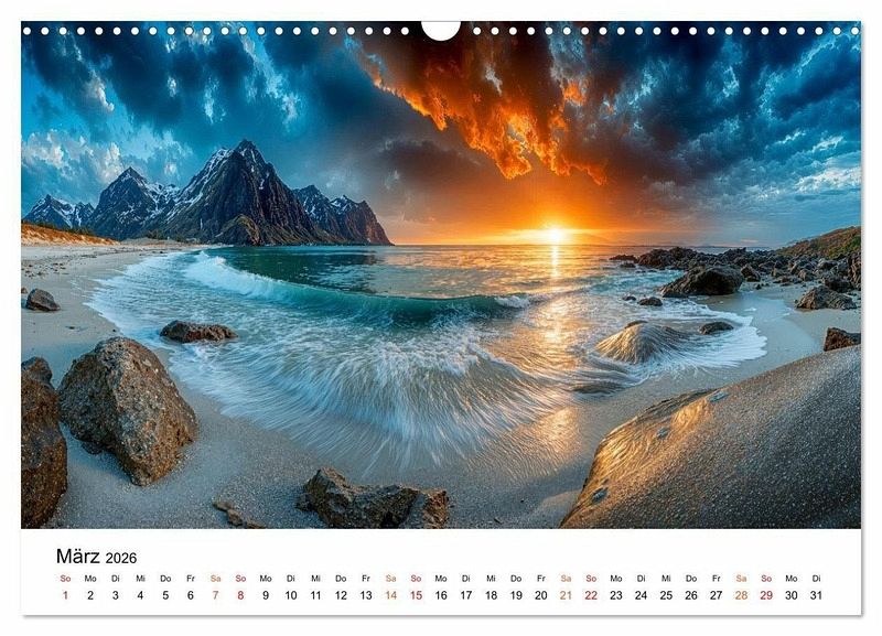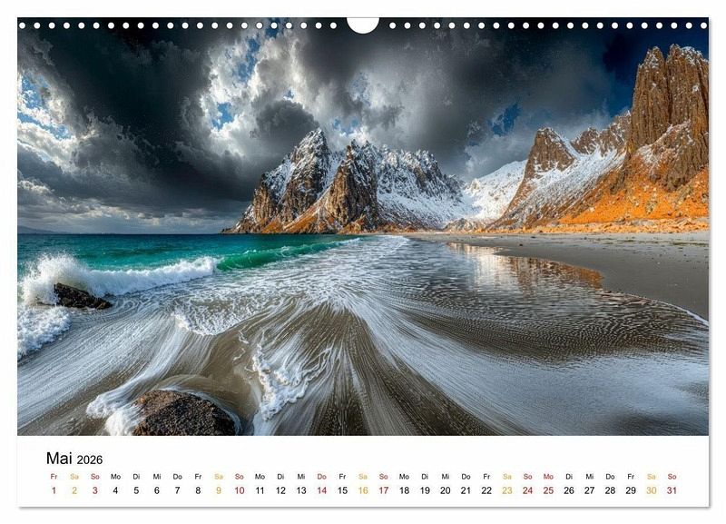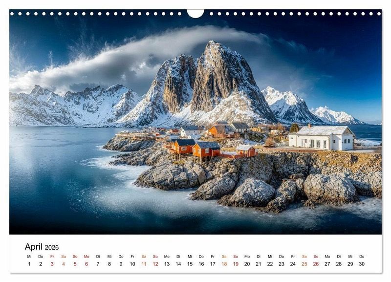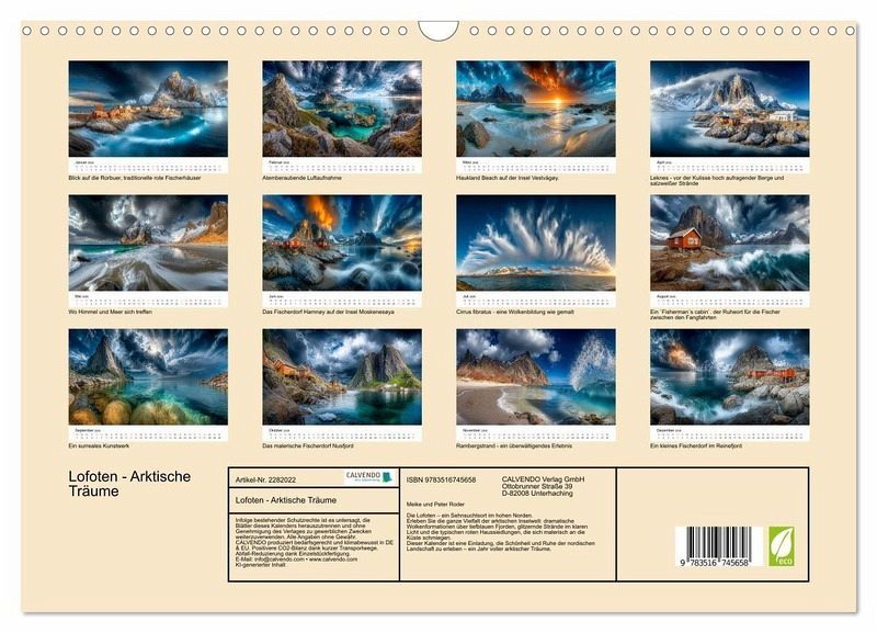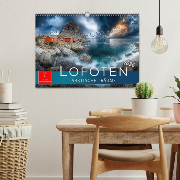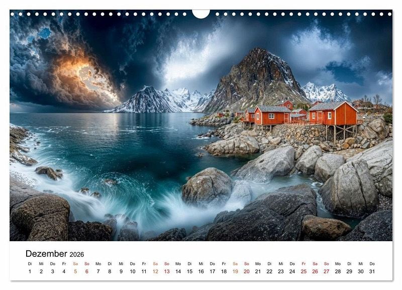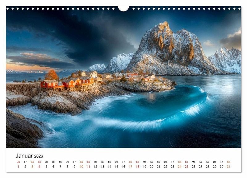 Ein Jahr voller Sehnsucht nach dem Norden, lassen Sie sich Monat für Monat in die faszinierende Welt der Lofoten entführen. Jedes Bild ist ein Fenster in die arktische Schönheit - rau und zugleich poetisch. Mal schweben dramatische Wolkenformationen über den Fjorden, mal glitzern die weißen Strände im klaren Licht, mal schmiegen sich die typischen roten Haussiedlungen an die Küste. Gestaltet mit dem Auge fürs Detail werden diese Bilder zu einer faszinierenden Reise nördlich des Polarkreises, wobei die grafische Umsetzung im Zusammenspiel klassischer Gestaltung und ausgewählter KI-basierter Methoden erfolgte. Ein Kalender für alle, die die Kraft der Natur lieben und sich von nordischen Träumen begleiten lassen möchten.