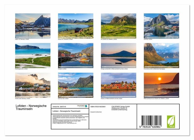QUALITÄT - Hochwertiger Fotokalender mit 12 wunderschönen Motiven auf lichtbeständigem Bilderdruckpapier, robuste Spiralbindung mit Aufhängebügel.NACHHALTIG - deutliche Abfallreduzierung durch bedarfsgerechte Einzelstückfertigung, umweltfreundliches FSC-zertifiziertes Papier, Produktion in Deutschland, klimabewusste Logistik.PERFEKTES GESCHENK - Kalender für Freunde und Familie, für Kinder und Erwachsene, jung und alt, zu Weihnachten, Geburtstag oder zwischendurch.VIELFALT - Bildkalender in verschiedenen Formaten, z.B. DIN A5, DIN A4, DIN A3 sowie DIN A2. Ob Naturmotiv, Gemälde oder Fotos, ideal für ein persönliches Wohlfühlambiente.Entdecken Sie die atemberaubenden Lofoten mit ihren paradiesischen Stränden und malerischen Dörfern von Autor(in): Elisabeth Schittenhelm
