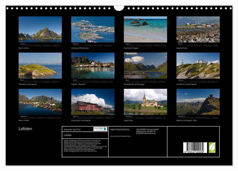 Kommen Sie mit auf die Lofoteninseln, die 100 bis 300 km nördlich des Polarkreises im Atlantik liegen. 13 wunderbare Landschaftsaufnahmen aus dieser unwirklichen und bizarren Inselwelt warten darauf, von Ihnen Monat für Monat entdeckt zu werden. Andreas Drees hat sich auf Landschaftsaufnahmen aus Skandinavien spezialisiert. In diesem Kalender hat er seine besten Fotografien einer Reise zu den Lofoten zusammengetragen. Immer wieder mit neuen spektakulären Blicken. Reisen Sie mit . . .
