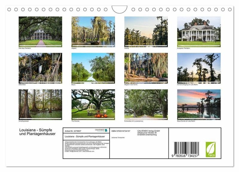 QUALITÄT - Hochwertiger Fotokalender mit 12 wunderschönen Motiven auf lichtbeständigem Bilderdruckpapier, robuste Spiralbindung mit Aufhängebügel.NACHHALTIG - deutliche Abfallreduzierung durch bedarfsgerechte Einzelstückfertigung, umweltfreundliches FSC-zertifiziertes Papier, Produktion in Deutschland, klimabewusste Logistik.PERFEKTES GESCHENK - Kalender für Freunde und Familie, für Kinder und Erwachsene, jung und alt, zu Weihnachten, Geburtstag oder zwischendurch.VIELFALT - Bildkalender in verschiedenen Formaten, z.B. DIN A5, DIN A4, DIN A3 sowie DIN A2. Ob Naturmotiv, Gemälde oder Fotos, ideal für ein persönliches Wohlfühlambiente.Bayous, moosverhangene Eichen, Plantagen von Autor(in): Johannes Tomaschko