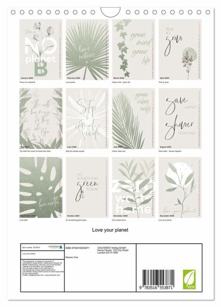 QUALITY - High-quality photo calendar with 12 beautiful images on light-resistant paper, robust spiral binding with hanger.SUSTAINABLE - Significant waste reduction due to print-on-demand production, environmentally friendly FSC-certified paper, produced in the UK, climate-conscious logistical processes.PERFECT GIFT - calendars for friends and family, for children, all ages and all occasions, from Christmas to birthdays and everything in between.LOTS OF CHOICE - Wall calendars in different sizes (DIN A4 and DIN A3), for any topic and personal taste, featuring photography, painting and illustrations.Sayings on environmental protection, author: Melanie Viola