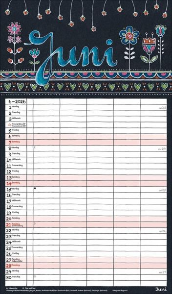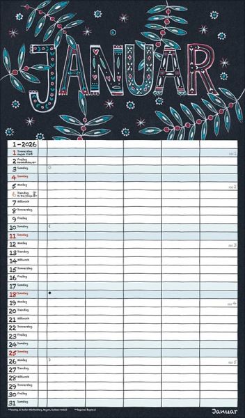 Kreide, pudrige Farben und verschnörkelte Buchstaben auf schwarzem Tafelhintergrund - Kreidekunst liegt voll im Trend. Die Motive der Illustratorin Mo Büdinger für den Familienplaner "Lovely Chalk Timer" sind handgemalt, mit viel Liebe zum Detail ausgearbeitet und farblich perfekt abgestimmt. Ein Begleiter durchs Jahr für Familien, die das Besondere suchen und Spaß an Trends haben. Mit fünf Spalten, Müllspalte sowie Ferienterminen und Vorschau bis März des Folgejahres. Exklusiv bei Korsch.