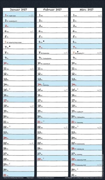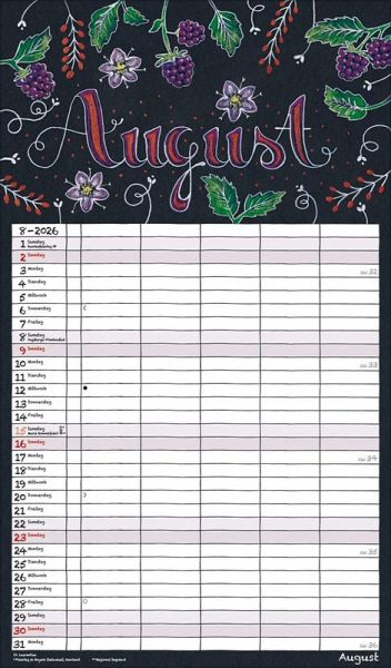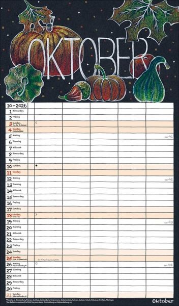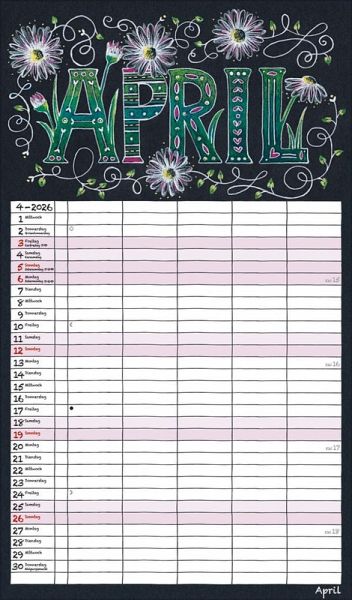 Übersichtlicher Familienplaner, 5 große Spalten; Format: 27x46 cm Praktische Zusatzspalte für Ferien, Müll und weitere Aktivitäten; stabile Rückwand Viel Platz für Eintragungen, ohne störende Bilder in den Spalten leichte Beschreibbarkeit, auch mit Bunt- und Bleistiften Deutsches Kalendarium mit regionalen Feiertagen für D, A und CH Gedruckt auf dickem und umweltfreundlichem FSC Papier