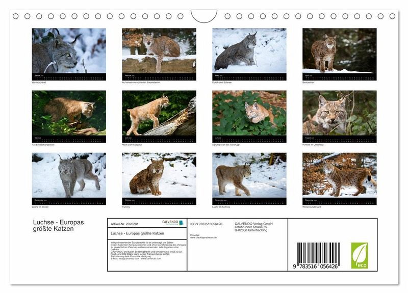 QUALITÄT - Hochwertiger Fotokalender mit 12 wunderschönen Motiven auf lichtbeständigem Bilderdruckpapier, robuste Spiralbindung mit Aufhängebügel.NACHHALTIG - deutliche Abfallreduzierung durch bedarfsgerechte Einzelstückfertigung, umweltfreundliches FSC-zertifiziertes Papier, Produktion in Deutschland, klimabewusste Logistik.PERFEKTES GESCHENK - Kalender für Freunde und Familie, für Kinder und Erwachsene, jung und alt, zu Weihnachten, Geburtstag oder zwischendurch.VIELFALT - Bildkalender in verschiedenen Formaten, z.B. DIN A5, DIN A4, DIN A3 sowie DIN A2. Ob Naturmotiv, Gemälde oder Fotos, ideal für ein persönliches Wohlfühlambiente.Wundervolle Fotografien vom eurasischen Luchs von Autor(in): Cloudtail the Snow Leopard