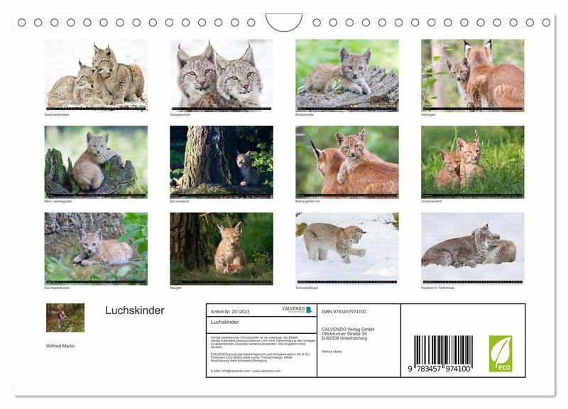 QUALITÄT - Hochwertiger Fotokalender mit 12 wunderschönen Motiven auf lichtbeständigem Bilderdruckpapier, robuste Spiralbindung mit Aufhängebügel.NACHHALTIG - deutliche Abfallreduzierung durch bedarfsgerechte Einzelstückfertigung, umweltfreundliches FSC-zertifiziertes Papier, Produktion in Deutschland, klimabewusste Logistik.PERFEKTES GESCHENK - Kalender für Freunde und Familie, für Kinder und Erwachsene, jung und alt, zu Weihnachten, Geburtstag oder zwischendurch.VIELFALT - Bildkalender in verschiedenen Formaten, z.B. DIN A5, DIN A4, DIN A3 sowie DIN A2. Ob Naturmotiv, Gemälde oder Fotos, ideal für ein persönliches Wohlfühlambiente.Zwölf faszinierende Luchswelpenporträts von Autor(in): Wilfried Martin