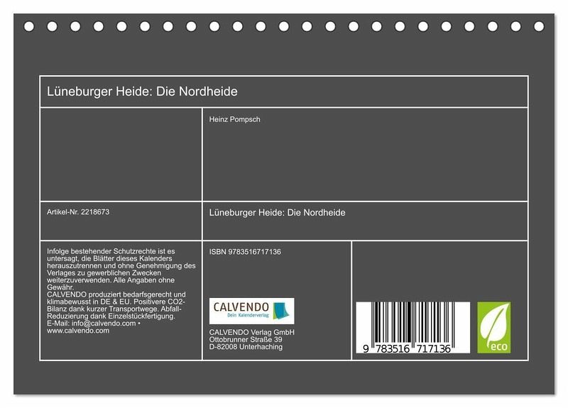 QUALITÄT - Hochwertiger Fotokalender mit 12 wunderschönen Motiven auf lichtbeständigem Bilderdruckpapier, robuste Spiralbindung.NACHHALTIG - deutliche Abfallreduzierung durch bedarfsgerechte Einzelstückfertigung, umweltfreundliches FSC-zertifiziertes Papier, Produktion in Deutschland, klimabewusste Logistik.PERFEKTES GESCHENK - Kalender für Freunde und Familie, für Kinder und Erwachsene, jung und alt, zu Weihnachten, Geburtstag oder zwischendurch.VIELFALT - Bildkalender in verschiedenen Formaten, z.B. DIN A5, DIN A4, DIN A3 sowie DIN A2. Ob Naturmotiv, Gemälde oder Fotos, ideal für ein persönliches Wohlfühlambiente.Die Lüneburger Heide ist eine wunderschöne Kulturlandschaft In Niedersachsen von Autor(in): Heinz Pompsch