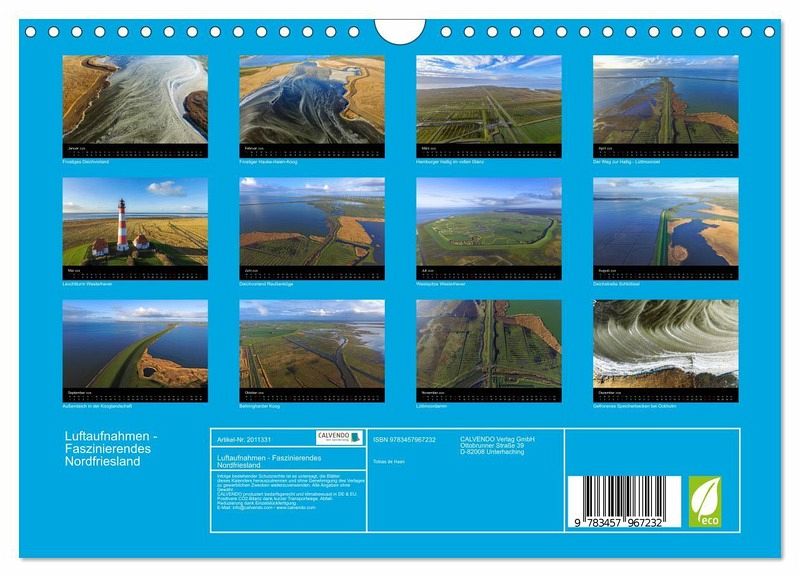 QUALITÄT - Hochwertiger Fotokalender mit 12 wunderschönen Motiven auf lichtbeständigem Bilderdruckpapier, robuste Spiralbindung mit Aufhängebügel.NACHHALTIG - deutliche Abfallreduzierung durch bedarfsgerechte Einzelstückfertigung, umweltfreundliches FSC-zertifiziertes Papier, Produktion in Deutschland, klimabewusste Logistik.PERFEKTES GESCHENK - Kalender für Freunde und Familie, für Kinder und Erwachsene, jung und alt, zu Weihnachten, Geburtstag oder zwischendurch.VIELFALT - Bildkalender in verschiedenen Formaten, z.B. DIN A5, DIN A4, DIN A3 sowie DIN A2. Ob Naturmotiv, Gemälde oder Fotos, ideal für ein persönliches Wohlfühlambiente.Das vielfältige, atemberaubende Nordfriesland aus einer ganz besonderen Perspektive - Luftaufnahmen, welche begeistern! von Autor(in): Tobias de Haan