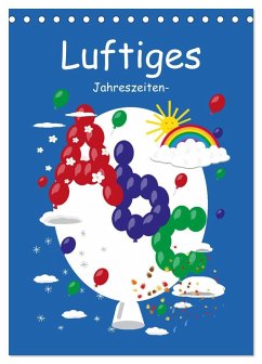 Zwölf lustige Bildmotive des Abc dargestellt durch schwebende Ballons, die unterhaltsam und dekorativ sind. Eingebettet in jahreszeitliche Kunstillustrationen.
