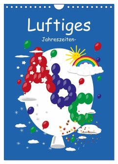 Zwölf lustige Bildmotive des Abc dargestellt durch schwebende Ballons, die unterhaltsam und dekorativ sind. Eingebettet in jahreszeitliche Kunstillustrationen.
