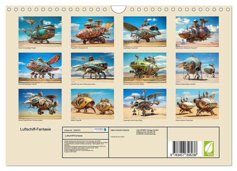 Fantasie Luftschiffe ist eine Perle für jeden, der Fantasie und unendliche Originalität liebt. Ob Sie ein Steampunk Fan sind oder einfach nur von surrealen Welten fasziniert sind, dieser Kalender wird Ihnen garantiert ein Lächeln ins Gesicht zaubern.