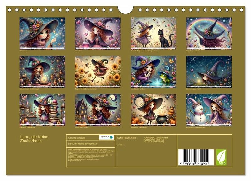 Entdecke eine bunte Welt voller Magie und Abenteuer mit Luna, der kleinen Zauberhexe! Zwölf liebevoll ki-generierte Motive führen durch das ganze Jahr und begeistern kleine Hexenfreunde jeden Monat aufs Neue. Mal trifft Luna eine neugierige schwarze Katze, mal entdeckt sie das Geheimnis einer Glaskugel oder braut einen geheimnisvollen Zaubertrank. Die niedlichen und fantasievollen Illustrationen machen jeden Monat zu einem ganz besonderen Erlebnis. Ideal zum Träumen, Lachen und Staunen - dieser Hexenzauber begleitet dich voller Freude durch alle Jahreszeiten.
