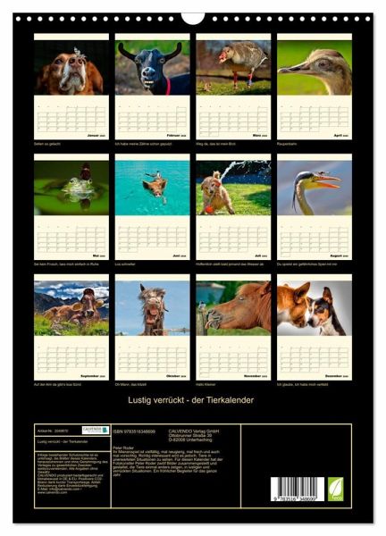 Ihr Mienenspiel ist vielfältig, mal neugierig, mal frech und auch mal vorsichtig. Richtig interessant wird es jedoch, Tiere in unerwarteten Situationen zu sehen. Für diesen Kalender hat der Fotokünstler Peter Roder zwölf Bilder zusammengestellt und gestaltet, die Tiere einmal anders zeigen, in lustigen und verrückten Situationen. Ein fröhlicher Begleiter für das ganze Jahr.