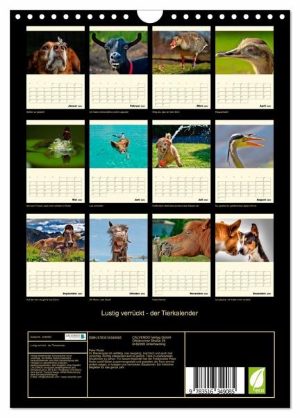Ihr Mienenspiel ist vielfältig, mal neugierig, mal frech und auch mal vorsichtig. Richtig interessant wird es jedoch, Tiere in unerwarteten Situationen zu sehen. Für diesen Kalender hat der Fotokünstler Peter Roder zwölf Bilder zusammengestellt und gestaltet, die Tiere einmal anders zeigen, in lustigen und verrückten Situationen. Ein fröhlicher Begleiter für das ganze Jahr.