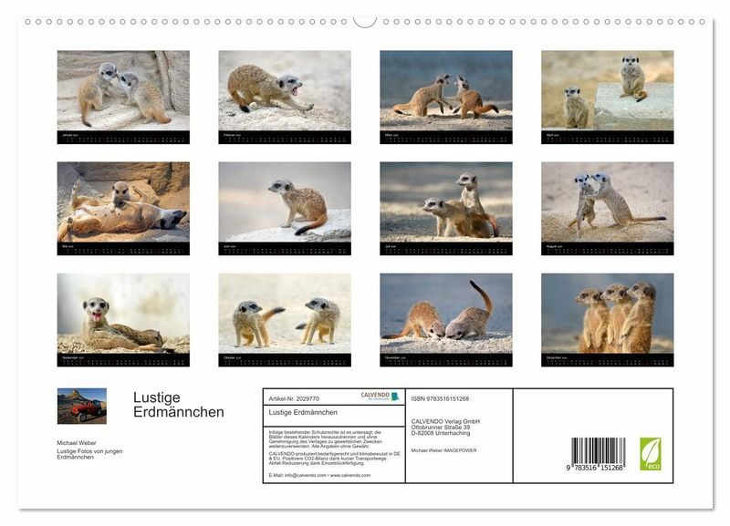 PREMIUM-LINIE - Brillanter Fotokalender mit 12 wunderschönen Motiven, Kunstdruck in Hochglanz in Museumsqualität.QUALITÄT - edle Materialien, stabile Rückwand mit 2 innovativen Einstecktaschen für eine optimale Präsentation an der Wand.NACHHALTIG - deutliche Abfallreduzierung durch bedarfsgerechte Einzelstückfertigung, umweltfreundliches FSC-zertifiziertes Papier, Produktion in Deutschland, klimabewusste Logistik.PERFEKTES GESCHENK - Kalender für Freunde und Familie, für Kinder und Erwachsene, jung und alt, zu Weihnachten, Geburtstag oder zwischendurch.Lustige Fotos von jungen Erdmännchen von Autor(in): Michael Weber