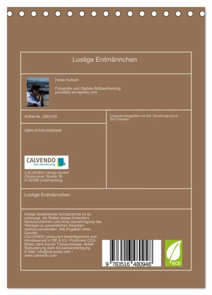 QUALITÄT - Hochwertiger Fotokalender mit 12wunderschönen Motiven auf lichtbeständigem Bilderdruckpapier, robuste Spiralbindung.NACHHALTIG - deutliche Abfallreduzierung durch bedarfsgerechte Einzelstückfertigung, umweltfreundliches FSC-zertifiziertes Papier, Produktion in Deutschland, klimabewusste Logistik.PERFEKTES GESCHENK - Kalender für Freunde und Familie, für Kinder und Erwachsene, jung und alt, zu Weihnachten, Geburtstag oder zwischendurch.VIELFALT - Bildkalender in verschiedenen Formaten, z.B. DIN A5, DIN A4, DIN A3 sowie DIN A2. Ob Naturmotiv, Gemälde oder Fotos, ideal für ein persönliches Wohlfühlambiente.Erdmännchen humorvoll präsentiert von Autor(in): Heike Hultsch