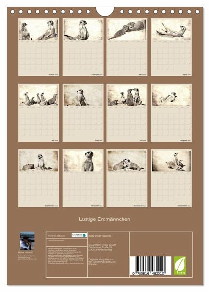 QUALITÄT - Hochwertiger Fotokalender mit 12 wunderschönen Motiven auf lichtbeständigem Bilderdruckpapier, robuste Spiralbindung mit Aufhängebügel.NACHHALTIG - deutliche Abfallreduzierung durch bedarfsgerechte Einzelstückfertigung, umweltfreundliches FSC-zertifiziertes Papier, Produktion in Deutschland, klimabewusste Logistik.PERFEKTES GESCHENK - Kalender für Freunde und Familie, für Kinder und Erwachsene, jung und alt, zu Weihnachten, Geburtstag oder zwischendurch.VIELFALT - Bildkalender in verschiedenen Formaten, z.B. DIN A5, DIN A4, DIN A3 sowie DIN A2. Ob Naturmotiv, Gemälde oder Fotos, ideal für ein persönliches Wohlfühlambiente.Erdmännchen humorvoll präsentiert von Autor(in): Heike Hultsch
