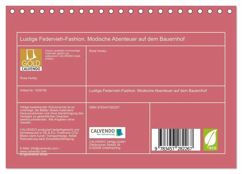 QUALITÄT - Hochwertiger Fotokalender mit 12 wunderschönen Motiven auf lichtbeständigem Bilderdruckpapier, robuste Spiralbindung.NACHHALTIG - deutliche Abfallreduzierung durch bedarfsgerechte Einzelstückfertigung, umweltfreundliches FSC-zertifiziertes Papier, Produktion in Deutschland, klimabewusste Logistik.PERFEKTES GESCHENK - Kalender für Freunde und Familie, für Kinder und Erwachsene, jung und alt, zu Weihnachten, Geburtstag oder zwischendurch.VIELFALT - Bildkalender in verschiedenen Formaten, z.B. DIN A5, DIN A4, DIN A3 sowie DIN A2. Ob Naturmotiv, Gemälde oder Fotos, ideal für ein persönliches Wohlfühlambiente.Lassen Sie sich von den schicken Hühnern inspirieren! von Autor(in): Rose Hurley