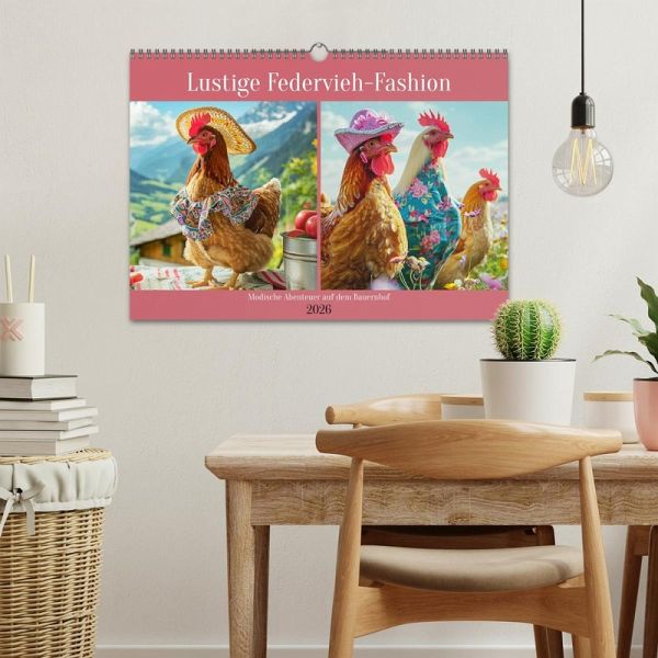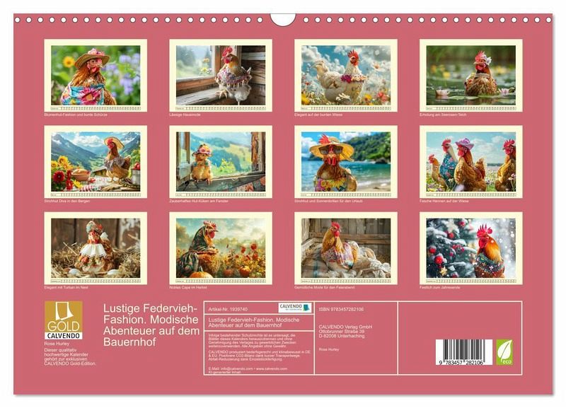 Willkommen in der Welt der schicken Hühner.Diese einzigartige Sammlung zeigt Hühner und Hähne, die sich als tierische Models bei einem modischen Fotoshooting in den Bergen, auf der Blumenwiese und am Wasser präsentieren. Von klassisch eleganten Hühnern mit stilvollen Kopfbedeckungen bis hin zu trendigen Hähnen mit farbenfrohen Schals - jeder Monat enthüllt einen neuen Look, der mit Hilfe von KI erstellt wurde und die neuesten Federtrends auf unterhaltsame Weise interpretiert. Dieser qualitativ hochwertige Kalender gehört zur exklusiven CALVENDO Gold-Edition.