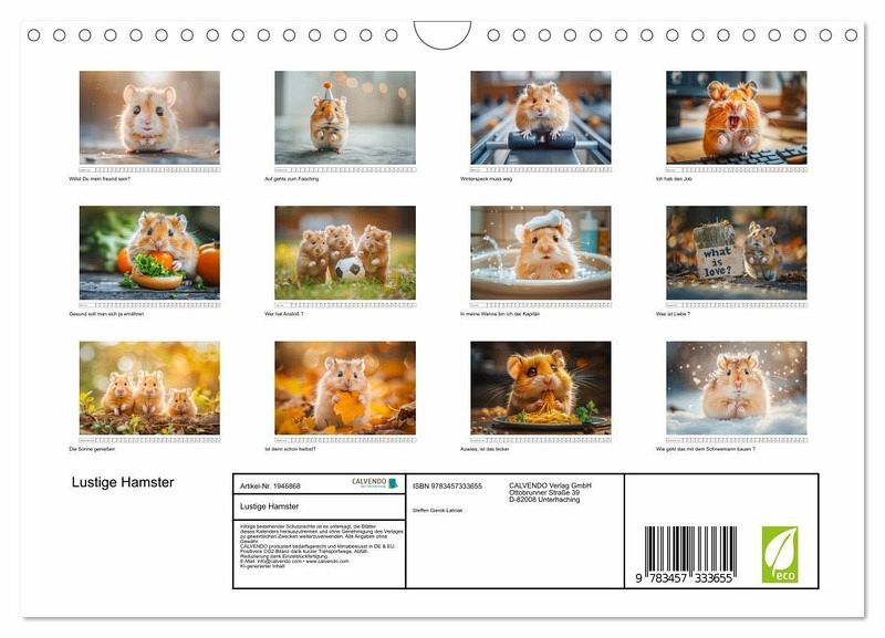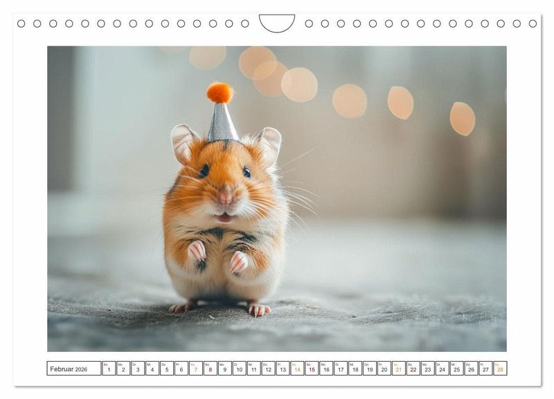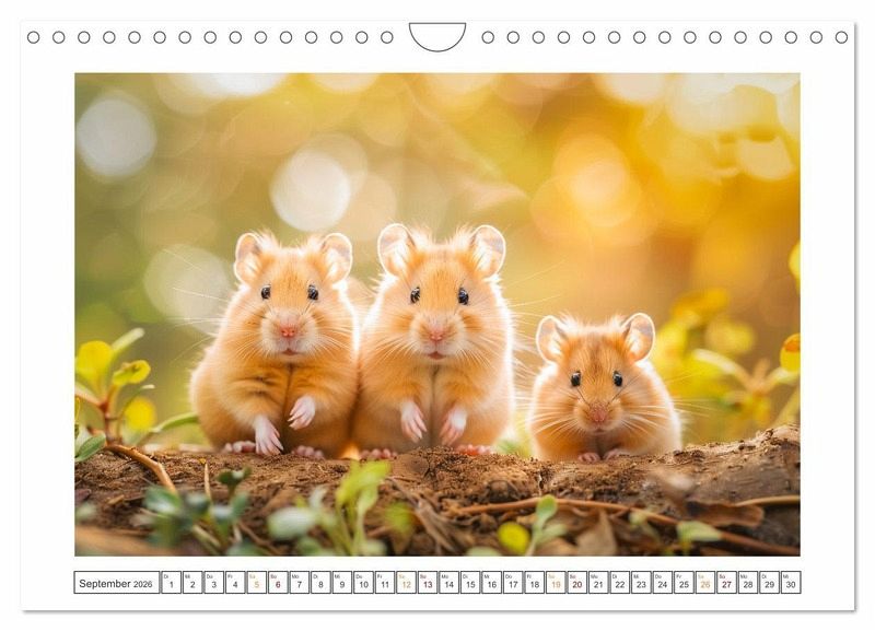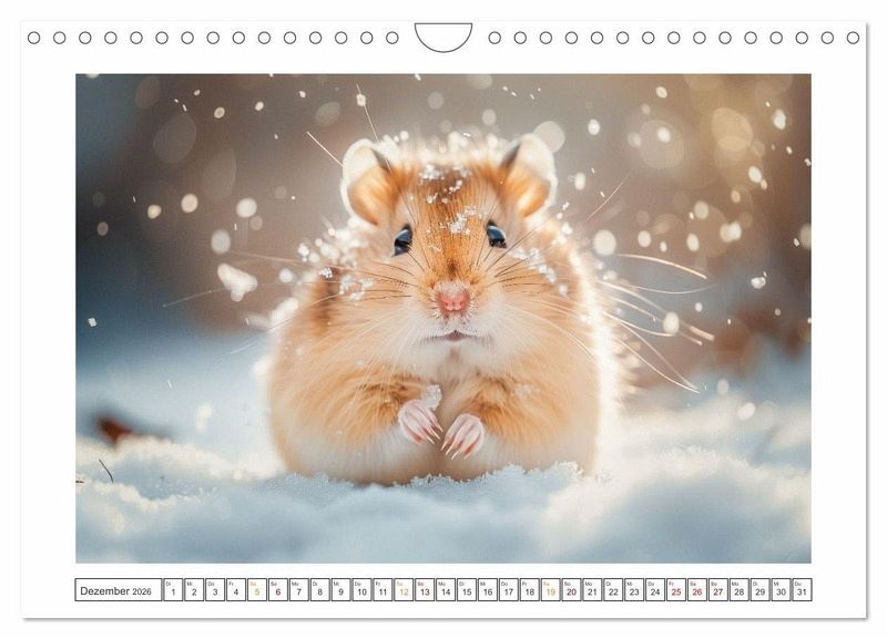 Willkommen im Reich der kleinen Kugeln voller Spaß und Lachen! Unsere lustigen kleinen Hamster sind nicht nur niedlich anzusehen, sondern auch echte Entertainer! Mit ihren putzigen Gesichtern und ihrem verspielten Wesen verzaubern sie jedes Zuhause im Handumdrehen. Ob sie in ihrem Hamsterrad herumrasen oder frech durch ihre Röhren flitzen - diese kleinen Fellnasen bringen die Sonne in Ihren Alltag. Holen Sie sich noch heute Ihren eigenen Bündel Freude und erleben Sie unendlich viele Momente voller Lachen und Liebe! Alle hier gezeigten Bilder wurden mit Sorgfalt, Liebe und mit Hilfe einer KI generiert. Abschließend werden sie mit Bildbearbeitungsprogrammen überarbeitet und in den Kalender eingefügt.