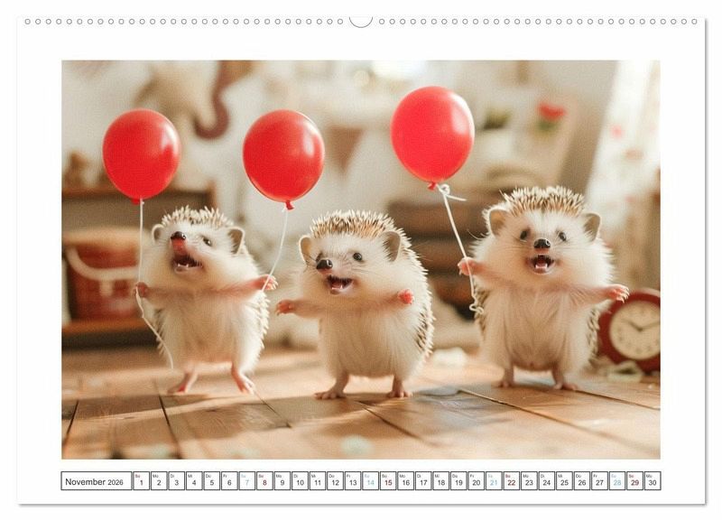 Ob beim Erkunden neuer Verstecke oder beim Genießen einer gemütlichen Kuschelzeit, diese niedlichen Gesellen sind immer für ein Lächeln bereit. Bringen Sie mit unseren lustigen Igeln eine Extraportion Spaß und Freude in Ihr Zuhause, denn das Glück kommt in stacheliger Form. Alle hier gezeigten Bilder wurden mit Sorgfalt, Liebe und mit Hilfe einer KI generiert. Abschließend werden sie mit Bildbearbeitungsprogrammen überarbeitet und in den Kalender eingefügt.