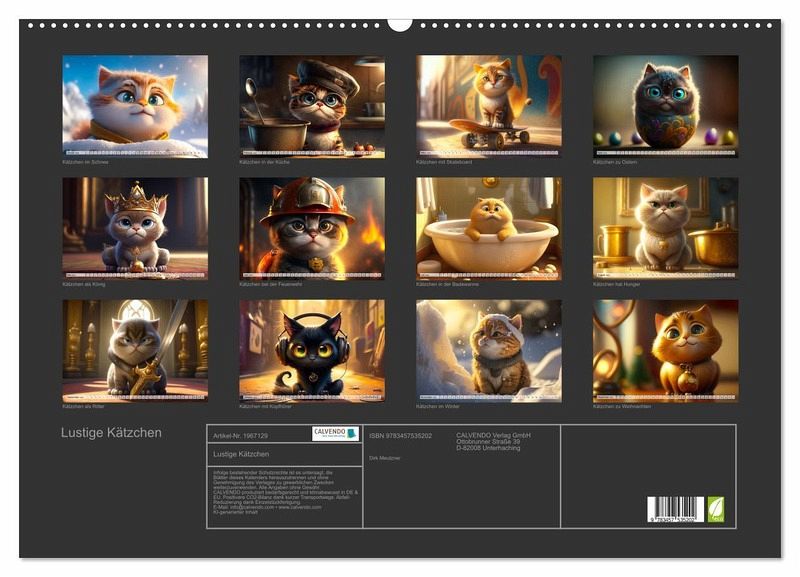 Wer liebt Sie nicht, die kleinen Stubentiger. Der Fotograf Dirk Meutzner hat zwölf farbenfrohe, lustige Bilder von lustigen Kätzchen für Sie gestaltet. Herausgekommen ist dieser herrliche, einmalige Kalender für jeden Katzenliebhaber. Er wird Sie Monat für Monat zum Schmunzeln bringen und Ihr Herz erwärmen. Produziert wurden die Bilder mit KI und Photoshop.