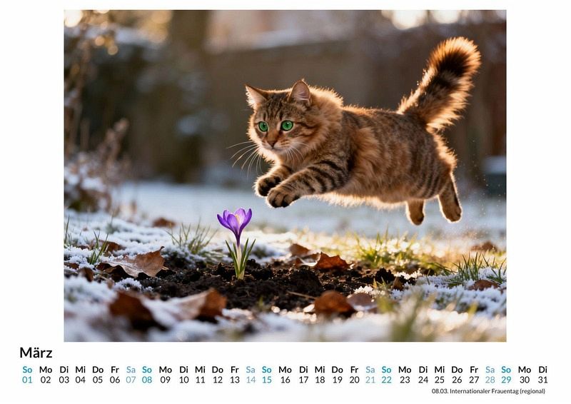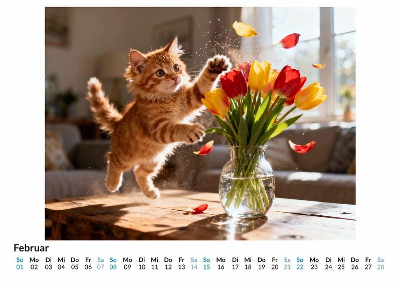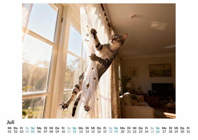 Was passiert, wenn die Schwerkraft für einen Moment Urlaub macht und eine Katze beschließt, genau dann ihre akrobatischen Fähigkeiten zu testen? Die Antwort darauf liefert dieser Kalender, der die komischsten Momente aus dem geheimen Leben unserer Stubentiger festhält. Dieser Kalender ist die perfekte Wahl: * Für alle Katzenfreunde mit einem ausgeprägten Sinn für Humor. * Für Menschen, die das Absurde im Alltäglichen lieben. * Für jeden, der seinen Tag mit einem Lachen beginnen möchte. Der Kalender "Lustige Katzen" zeigt zwölf Szenen, die genau diese Fragen mit einem Augenzwinkern beantworten. Man sieht Samtpfoten, die mit der Tücke des Objekts kämpfen, Sprünge, die in einer flauschigen Bruchlandung enden, und Posen, die jeder physikalischen Logik widersprechen. Diese Szenen wurden nicht einfach fotografiert, sondern aus unzähligen Datenpunkten und einer Idee von Komik errechnet, um einzigartige Momente zu schaffen. Jeder Monat enthüllt ein neues, komisches Missgeschick, das die ansonsten so eleganten Tiere in einem ganz anderen Licht zeigt. Was der Kalender bietet: * Zwölf Monatsbilder voller Situationskomik. * Ein übersichtliches Kalendarium für Termine und Geburtstage. * Ein Wandkalender, der jeden Monat ein neues Schmunzeln schenkt. Dieser Kalender ist mehr als ein Zeitplaner; er ist eine tägliche Quelle der guten Laune. Er fängt die liebenswerte Unbeholfenheit von Katzen ein und sorgt für heitere Momente im Alltag. Es lohnt sich, einen Blick auf die Monatsmotive zu werfen und sich von der Komik anstecken zu lassen.