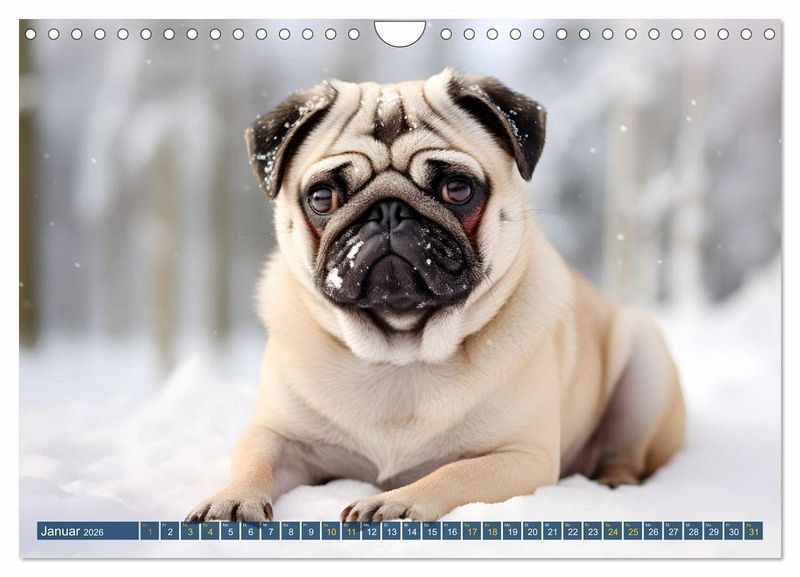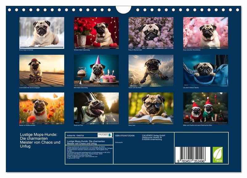 Der Kalender "Lustige Mops-Hunde: Die charmanten Meister von Chaos und Unfug" präsentiert zwölf entzückende, humorvolle Porträts von Mopshunden in alltäglichen, doch außergewöhnlichen Situationen. Jeder Monat offenbart einen neuen, charmanten Mops, der mit seinem einzigartigen Charakter und Ausdruck das Herz erobert. Von verspielten Posen im Park bis hin zu gemütlichen Momenten zu Hause, diese Mops-Fotos bringen Freude und Lachen in jeden Tag. Dieser mithilfe von K.I erstellte Kalender ist eine Hommage an die Liebe und das Vergnügen, die diese kleinen Helden in unser Leben bringen. Ideal für Mops-Liebhaber und alle, die ein Lächeln brauchen