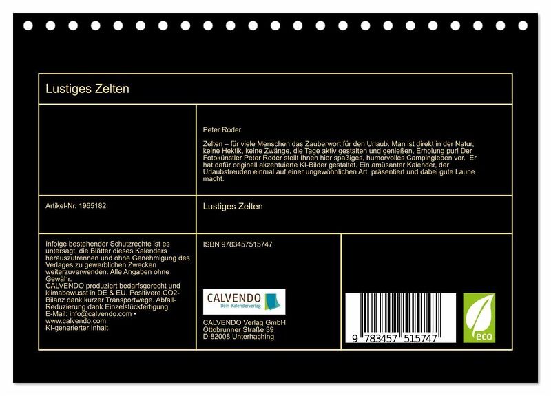 Zelten - für viele Menschen das Zauberwort für den Urlaub. Man ist direkt in der Natur, keine Hektik, keine Zwänge, die Tage aktiv gestalten und genießen, Erholung pur! Der Fotokünstler Peter Roder stellt Ihnen hier spaßiges, humorvolles Campingleben vor. Er hat dafür originell akzentuierte KI-Bilder gestaltet. Ein amüsanter Kalender, der Urlaubsfreuden einmal auf einer ungewöhnlichen Art präsentiert und dabei gute Laune macht.
