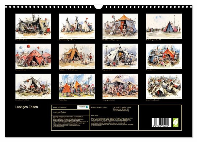 Zelten - für viele Menschen das Zauberwort für den Urlaub. Man ist direkt in der Natur, keine Hektik, keine Zwänge, die Tage aktiv gestalten und genießen, Erholung pur! Der Fotokünstler Peter Roder stellt Ihnen hier spaßiges, humorvolles Campingleben vor. Er hat dafür originell akzentuierte KI-Bilder gestaltet. Ein amüsanter Kalender, der Urlaubsfreuden einmal auf einer ungewöhnlichen Art präsentiert und dabei gute Laune macht.