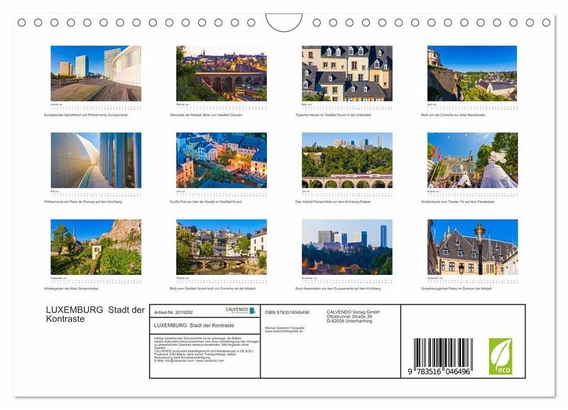 QUALITÄT - Hochwertiger Fotokalender mit 12 wunderschönen Motiven auf lichtbeständigem Bilderdruckpapier, robuste Spiralbindung mit Aufhängebügel.NACHHALTIG - deutliche Abfallreduzierung durch bedarfsgerechte Einzelstückfertigung, umweltfreundliches FSC-zertifiziertes Papier, Produktion in Deutschland, klimabewusste Logistik.PERFEKTES GESCHENK - Kalender für Freunde und Familie, für Kinder und Erwachsene, jung und alt, zu Weihnachten, Geburtstag oder zwischendurch.VIELFALT - Bildkalender in verschiedenen Formaten, z.B. DIN A5, DIN A4, DIN A3 sowie DIN A2. Ob Naturmotiv, Gemälde oder Fotos, ideal für ein persönliches Wohlfühlambiente.13 faszinierende Aufnahmen der Stadt Luxemburg, der Hauptstadt des Großherzogtums Luxemburg. von Autor(in): Werner Dieterich
