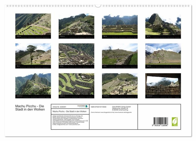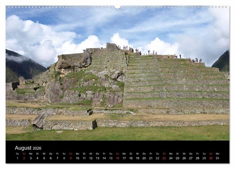 Dieser Kalender bringt dem Betrachter Monat für Monat die Faszination der Inkastadt Machu Picchu in den Anden von Peru näher. Gelegen auf einem Hochplateau umgibt diese Stadt etwas Mystisches und schließt die Besucher noch heute in ihren Bann. Machen Sie sich selbst ein Bild und tauchen für 12 Monate in diese weit entfernte Kultur ein.