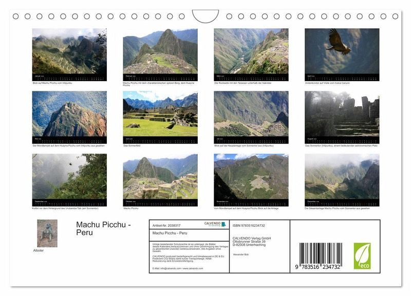 QUALITÄT - Hochwertiger Fotokalender mit 12 wunderschönen Motiven auf lichtbeständigem Bilderdruckpapier, robuste Spiralbindung mit Aufhängebügel.NACHHALTIG - deutliche Abfallreduzierung durch bedarfsgerechte Einzelstückfertigung, umweltfreundliches FSC-zertifiziertes Papier, Produktion in Deutschland, klimabewusste Logistik.PERFEKTES GESCHENK - Kalender für Freunde und Familie, für Kinder und Erwachsene, jung und alt, zu Weihnachten, Geburtstag oder zwischendurch.VIELFALT - Bildkalender in verschiedenen Formaten, z.B. DIN A5, DIN A4, DIN A3 sowie DIN A2. Ob Naturmotiv, Gemälde oder Fotos, ideal für ein persönliches Wohlfühlambiente.Der mystische Ort der Inkas von Autor(in): Alexander Bob