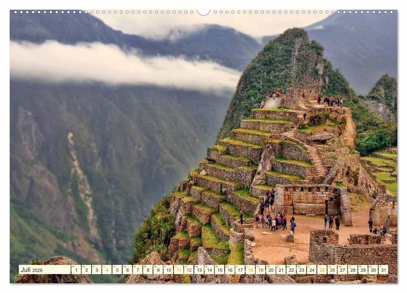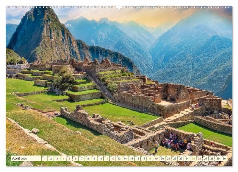 Die gut erhaltene Ruinenstadt Machu Picchu wurde von den Inka im 15. Jahrhundert in 2360 Metern Höhe auf einem Bergrücken in den Anden Perus terrassenförmig erbaut . Die Stadt umfasste 216 steinerne Bauten, die mit einem System von Treppen verbunden waren. Forscher gehen heute davon aus, dass die Stadt in ihrer Blütezeit bis zu 1000 Menschen aufnehmen und versorgen konnte. Machu Picchu ist eine der größten Touristenattraktionen in Südamerika und wird täglich von durchschnittlich 2000 Menschen besucht. Die UNESCO, die die Sehenswürdigkeit Machu Picchu 1983 in die Liste des Weltkulturerbes aufnahm, fordert eine erheblich Reduktion der Besucher, um das Kulturerbe nicht zu gefährden. Für diesen Kalender hat der Fotokünstler Peter Roder zwölf wunderschöne Aufnahmen dieser alten Inka-Stadt zusammengestellt und gestaltet, ein beeindruckender Begleiter für das ganze Jahr.