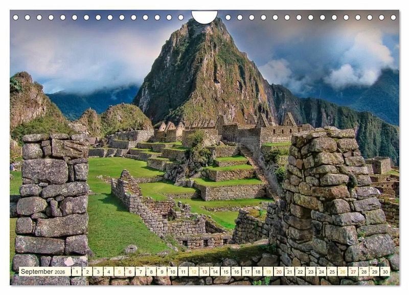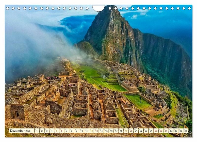 Die gut erhaltene Ruinenstadt Machu Picchu wurde von den Inka im 15. Jahrhundert in 2360 Metern Höhe auf einem Bergrücken in den Anden Perus terrassenförmig erbaut . Die Stadt umfasste 216 steinerne Bauten, die mit einem System von Treppen verbunden waren. Forscher gehen heute davon aus, dass die Stadt in ihrer Blütezeit bis zu 1000 Menschen aufnehmen und versorgen konnte. Machu Picchu ist eine der größten Touristenattraktionen in Südamerika und wird täglich von durchschnittlich 2000 Menschen besucht. Die UNESCO, die die Sehenswürdigkeit Machu Picchu 1983 in die Liste des Weltkulturerbes aufnahm, fordert eine erheblich Reduktion der Besucher, um das Kulturerbe nicht zu gefährden. Für diesen Kalender hat der Fotokünstler Peter Roder zwölf wunderschöne Aufnahmen dieser alten Inka-Stadt zusammengestellt und gestaltet, ein beeindruckender Begleiter für das ganze Jahr.