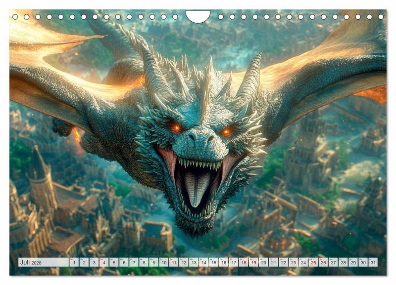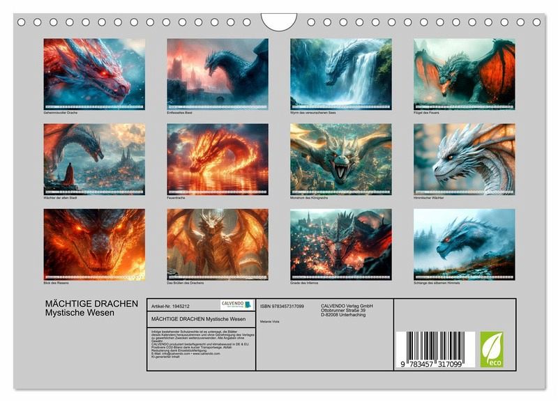 Erleben Sie eine faszinierende Reise durch das Reich dieser legendären Kreaturen. Jeder Monat zeigt atemberaubende Bilder von Drachen in ihrer majestätischen Pracht, von einem Wyrm des verzauberten Sees bis hin zu uralten Wächtern. Erleben Sie die ehrfurchtgebietende Macht dieser schlangenartigen Titanen, deren Schuppen vor überirdischer Kraft schimmern und deren Augen vor uralter Weisheit leuchten. Dieser Kalender ist perfekt für Fantasy-Fans und lässt Sie in eine Welt eintauchen, in der Drachen die Oberhand haben, und lässt Mythos und Magie auf jeder Seite aufleben. Die Motive wurden in Zusammenarbeit mit künstlicher Intelligenz erstellt.