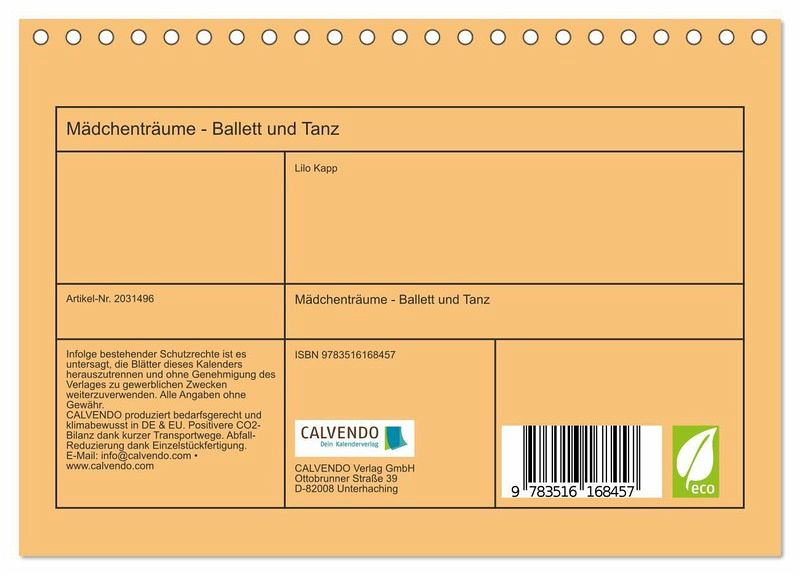 QUALITÄT - Hochwertiger Fotokalender mit 12 wunderschönen Motiven auf lichtbeständigem Bilderdruckpapier, robuste Spiralbindung.NACHHALTIG - deutliche Abfallreduzierung durch bedarfsgerechte Einzelstückfertigung, umweltfreundliches FSC-zertifiziertes Papier, Produktion in Deutschland, klimabewusste Logistik.PERFEKTES GESCHENK - Kalender für Freunde und Familie, für Kinder und Erwachsene, jung und alt, zu Weihnachten, Geburtstag oder zwischendurch.VIELFALT - Bildkalender in verschiedenen Formaten, z.B. DIN A5, DIN A4, DIN A3 sowie DIN A2. Ob Naturmotiv, Gemälde oder Fotos, ideal für ein persönliches Wohlfühlambiente.Motive aus der Welt des Balletts und des Tanzes begleiten durch das Jahr von Autor(in): Lilo Kapp