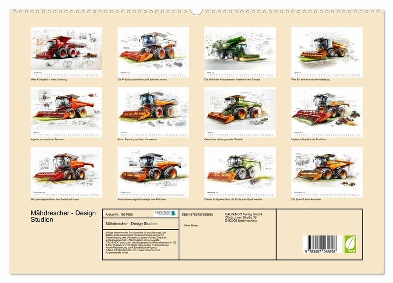 Innovation beginnt mit einer Skizze - und dieser Kalender fängt genau diesen Moment ein. Jedes Blatt zeigt einen einzigartigen Mähdrescher, dessen Design fast futuristisch anmutet. Die Maschinen wirken, als wären sie speziell für unterschiedlichste Erntearten entwickelt worden - jede mit einer eigenen, beeindruckenden Konstruktion. Doch das Besondere sind die feinen Bleistift-Skizzen, die den Maschinen Leben einhauchen. Sie umrahmen jedes KI-Bild wie Gedanken eines Konstrukteurs, der noch mitten im kreativen Prozess steckt. Notizen, Linienführungen und technische Details verleihen dem Kalender eine außergewöhnliche Authentizität - als würde man direkt in ein Ingenieursatelier blicken. Perfekt für alle, die sich für Maschinen, Design und Innovation begeistern.