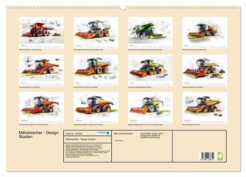 Innovation beginnt mit einer Skizze - und dieser Kalender fängt genau diesen Moment ein. Jedes Blatt zeigt einen einzigartigen Mähdrescher, dessen Design fast futuristisch anmutet. Die Maschinen wirken, als wären sie speziell für unterschiedlichste Erntearten entwickelt worden - jede mit einer eigenen, beeindruckenden Konstruktion. Doch das Besondere sind die feinen Bleistift-Skizzen, die den Maschinen Leben einhauchen. Sie umrahmen jedes KI-Bild wie Gedanken eines Konstrukteurs, der noch mitten im kreativen Prozess steckt. Notizen, Linienführungen und technische Details verleihen dem Kalender eine außergewöhnliche Authentizität - als würde man direkt in ein Ingenieursatelier blicken. Perfekt für alle, die sich für Maschinen, Design und Innovation begeistern.