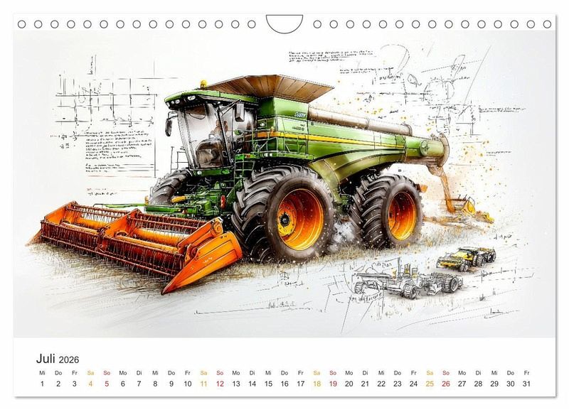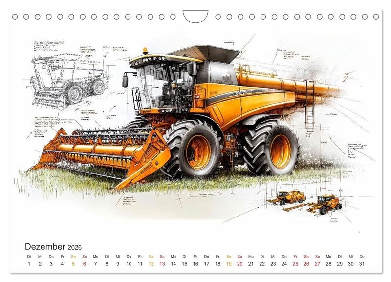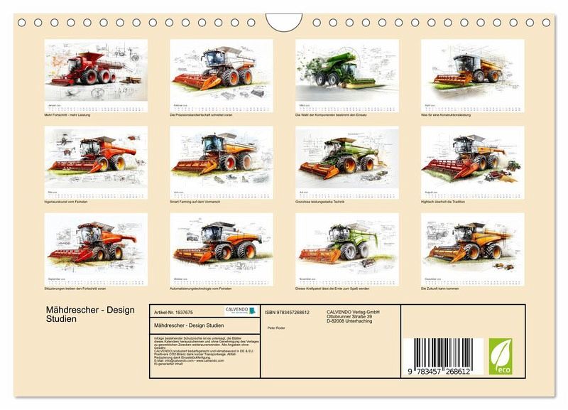 Innovation beginnt mit einer Skizze - und dieser Kalender fängt genau diesen Moment ein. Jedes Blatt zeigt einen einzigartigen Mähdrescher, dessen Design fast futuristisch anmutet. Die Maschinen wirken, als wären sie speziell für unterschiedlichste Erntearten entwickelt worden - jede mit einer eigenen, beeindruckenden Konstruktion. Doch das Besondere sind die feinen Bleistift-Skizzen, die den Maschinen Leben einhauchen. Sie umrahmen jedes KI-Bild wie Gedanken eines Konstrukteurs, der noch mitten im kreativen Prozess steckt. Notizen, Linienführungen und technische Details verleihen dem Kalender eine außergewöhnliche Authentizität - als würde man direkt in ein Ingenieursatelier blicken. Perfekt für alle, die sich für Maschinen, Design und Innovation begeistern.