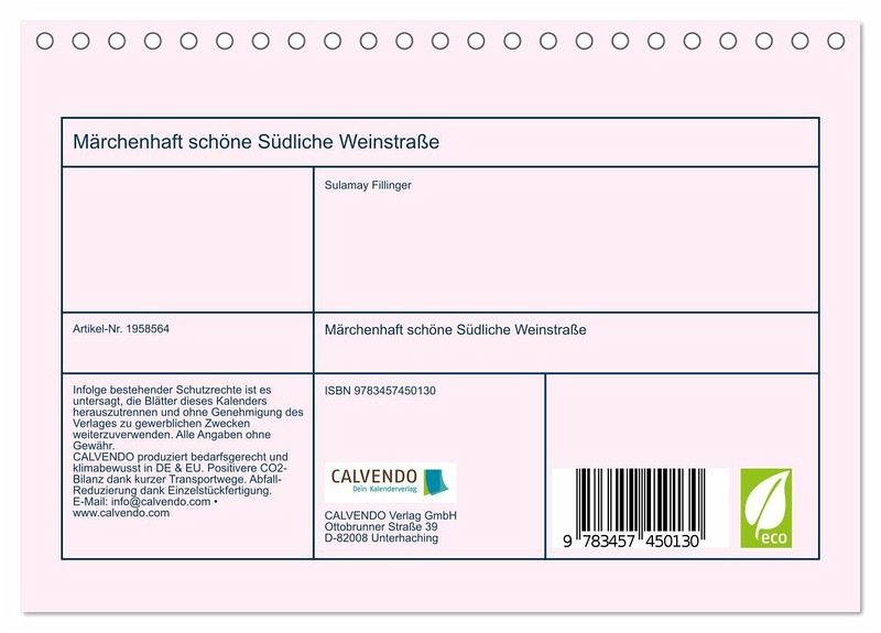QUALITÄT - Hochwertiger Fotokalender mit 12 wunderschönen Motiven auf lichtbeständigem Bilderdruckpapier, robuste Spiralbindung.NACHHALTIG - deutliche Abfallreduzierung durch bedarfsgerechte Einzelstückfertigung, umweltfreundliches FSC-zertifiziertes Papier, Produktion in Deutschland, klimabewusste Logistik.PERFEKTES GESCHENK - Kalender für Freunde und Familie, für Kinder und Erwachsene, jung und alt, zu Weihnachten, Geburtstag oder zwischendurch.VIELFALT - Bildkalender in verschiedenen Formaten, z.B. DIN A5, DIN A4, DIN A3 sowie DIN A2. Ob Naturmotiv, Gemälde oder Fotos, ideal für ein persönliches Wohlfühlambiente.Viele Orte entlang der Südlichen Weinstraße sind einen Urlaub, einen Ausflug wert, ob Burgen, Winzerorte oder Weinberge, alles ist paradiesich schön! von Autor(in): Sulamay Fillinger Fotografie