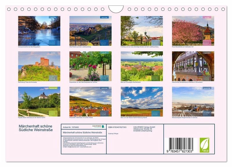 QUALITÄT - Hochwertiger Fotokalender mit 12 wunderschönen Motiven auf lichtbeständigem Bilderdruckpapier, robuste Spiralbindung mit Aufhängebügel.NACHHALTIG - deutliche Abfallreduzierung durch bedarfsgerechte Einzelstückfertigung, umweltfreundliches FSC-zertifiziertes Papier, Produktion in Deutschland, klimabewusste Logistik.PERFEKTES GESCHENK - Kalender für Freunde und Familie, für Kinder und Erwachsene, jung und alt, zu Weihnachten, Geburtstag oder zwischendurch.VIELFALT - Bildkalender in verschiedenen Formaten, z.B. DIN A5, DIN A4, DIN A3 sowie DIN A2. Ob Naturmotiv, Gemälde oder Fotos, ideal für ein persönliches Wohlfühlambiente.Viele Orte entlang der Südlichen Weinstraße sind einen Urlaub, einen Ausflug wert, ob Burgen, Winzerorte oder Weinberge, alles ist paradiesich schön! von Autor(in): Sulamay Fillinger Fotografie