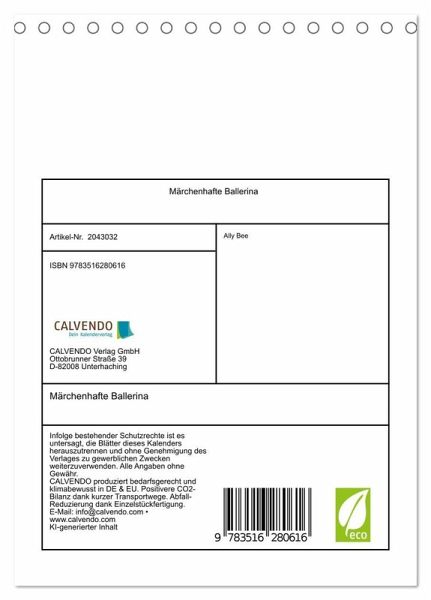 Tauchen Sie ein in die zauberhafte Welt des Balletts mit unserem bezaubernden KI-Kalender "Märchenhafte Ballerinas". Jedes Bild erzählt eine Geschichte voller Anmut und Mystik, während die Ballerinas in einer mystischen Atmosphäre tanzen. Entdecken Sie zwölf Monate voller Verzauberung, in denen die Ballerinas in traumhaften Szenarien verweilen, umgeben von einer Aura des Geheimnisvollen. Ganz gleich, ob Sie ein Liebhaber des Balletts sind oder einfach die Schönheit mystischer Ästhetik genießen - dieser Kalender wird Ihr Herz berühren und Ihre Sinne verzaubern.