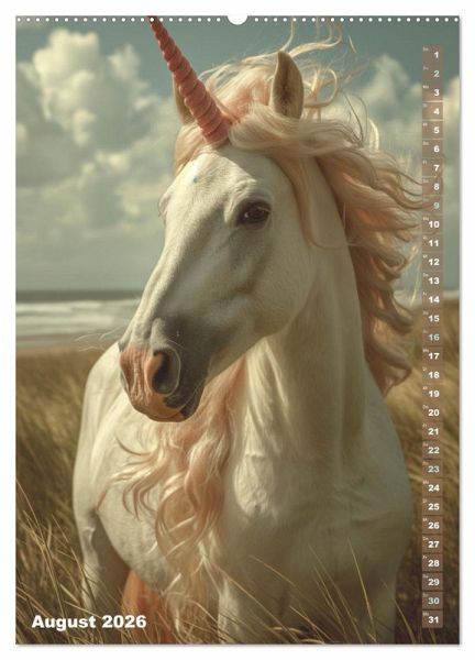 August: Küstenzauber: Ein weißes Einhorn zwischen Dünen und sanftem Strandgras
