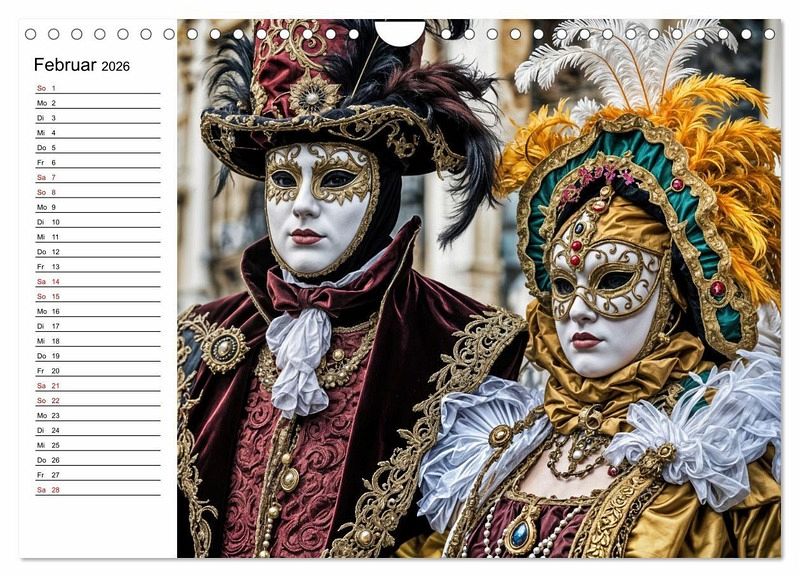 Tauchen Sie ein in die faszinierende Welt des venezianischen Karnevals mit unserem exklusiven Kalender, der die atemberaubendsten Masken und Kostüme dieser einzigartigen Tradition präsentiert. Jeder Monat enthüllt ein neues Meisterwerk aus kunstvoll gestalteten Masken und opulenten Gewändern, die die Magie und Mystik Venedigs zum Leben erwecken.